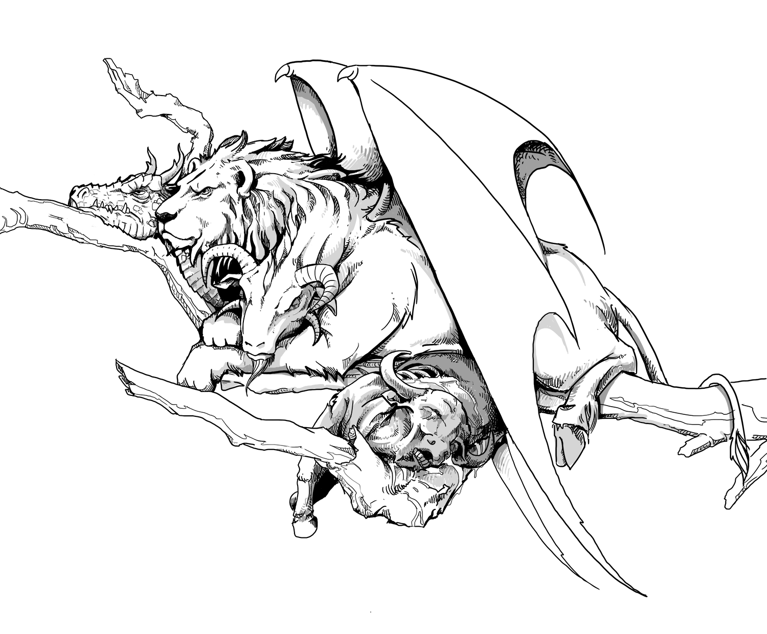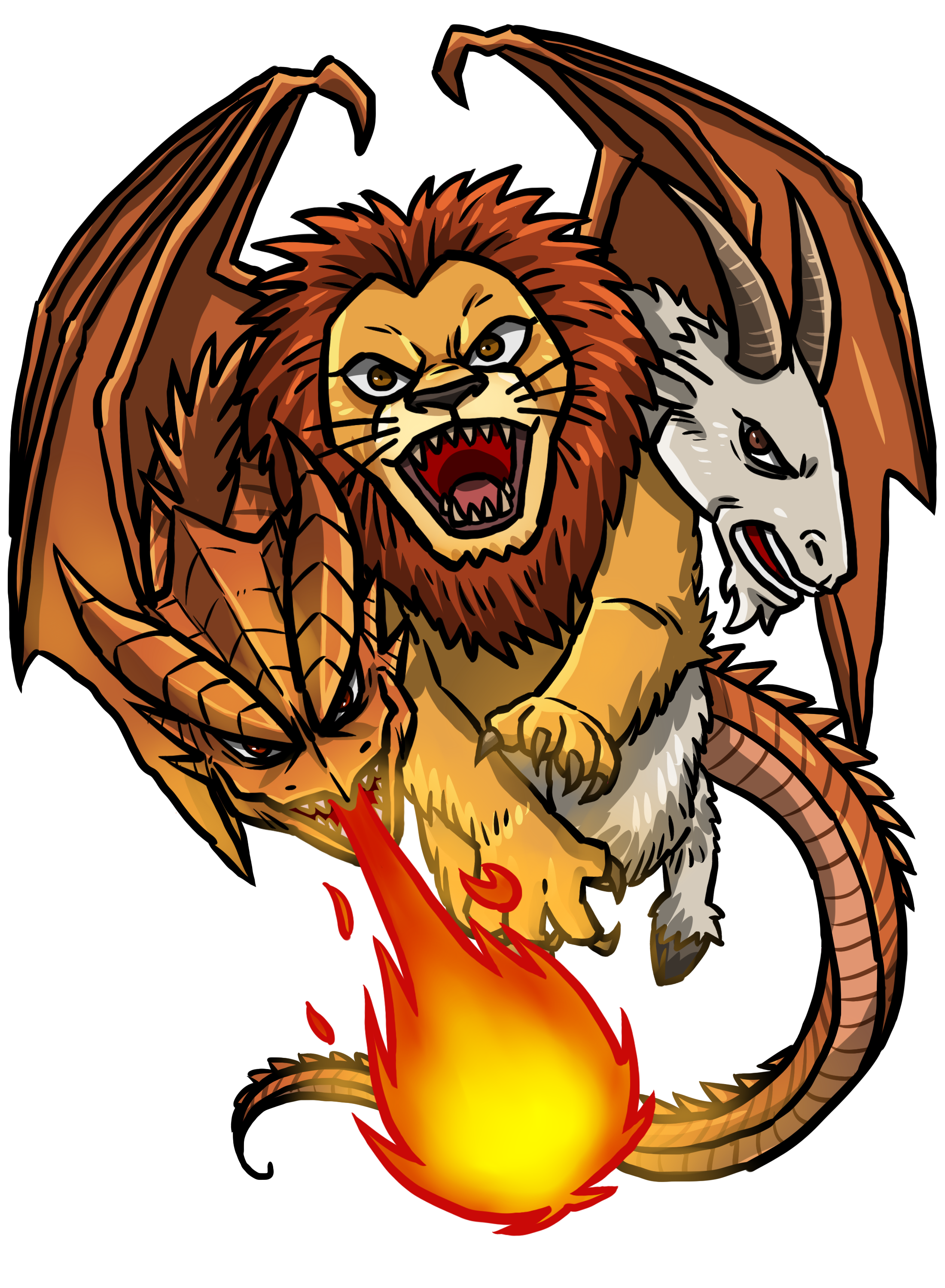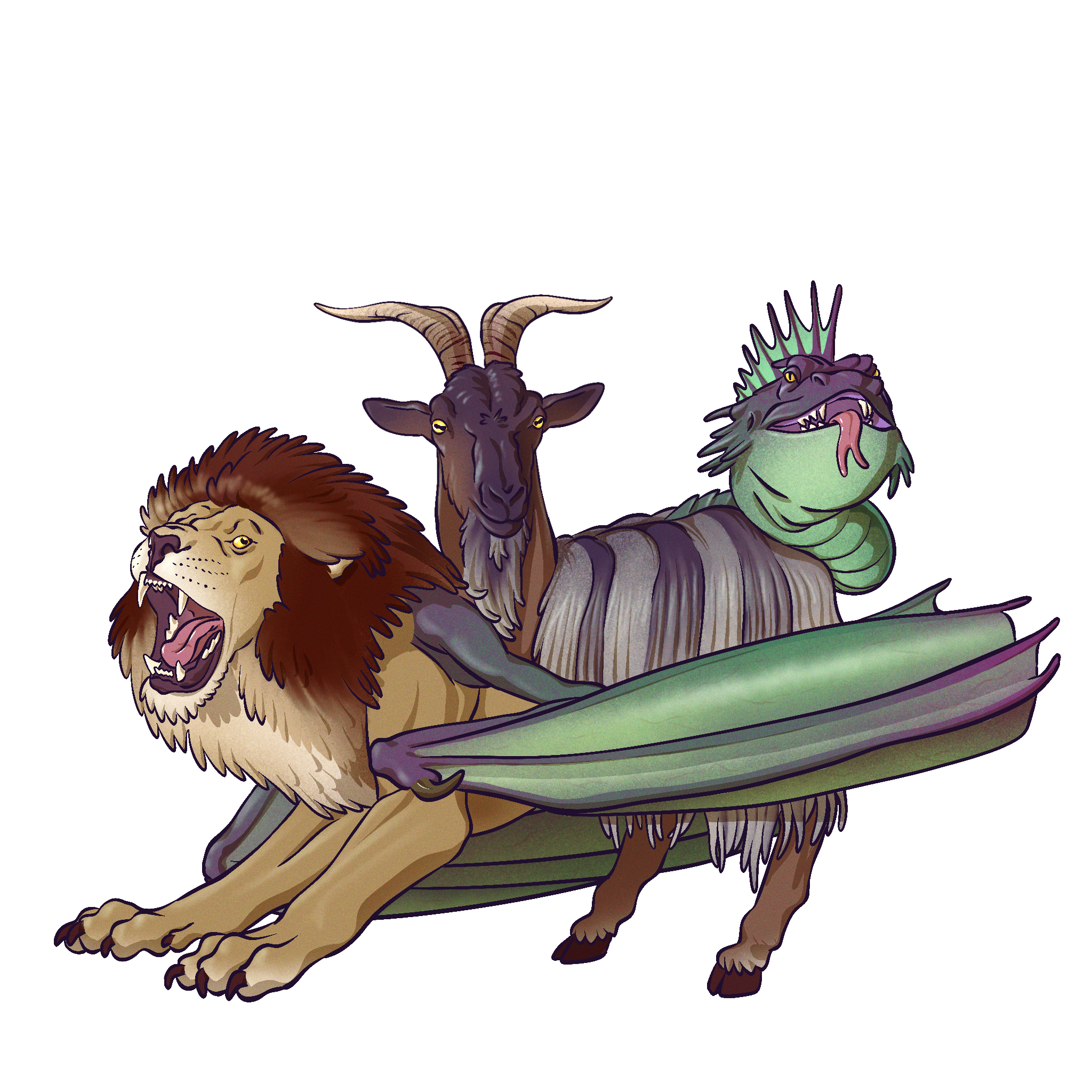 Horrific, hybrid monstrosities with the forequarters of a lion, the hindquarters of a goat, the wings of a dragon, and three heads: goat, lion, and dragon. Dwell in wild, hilly areas, or sometimes in dungeons.