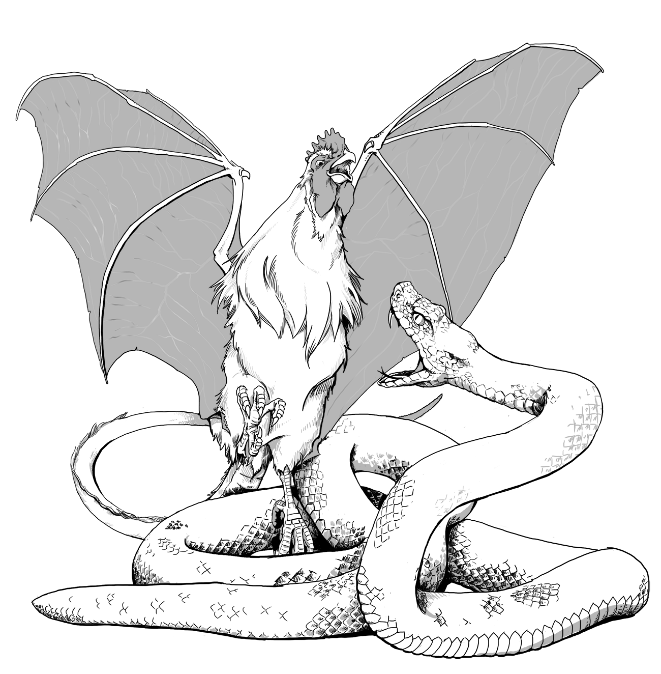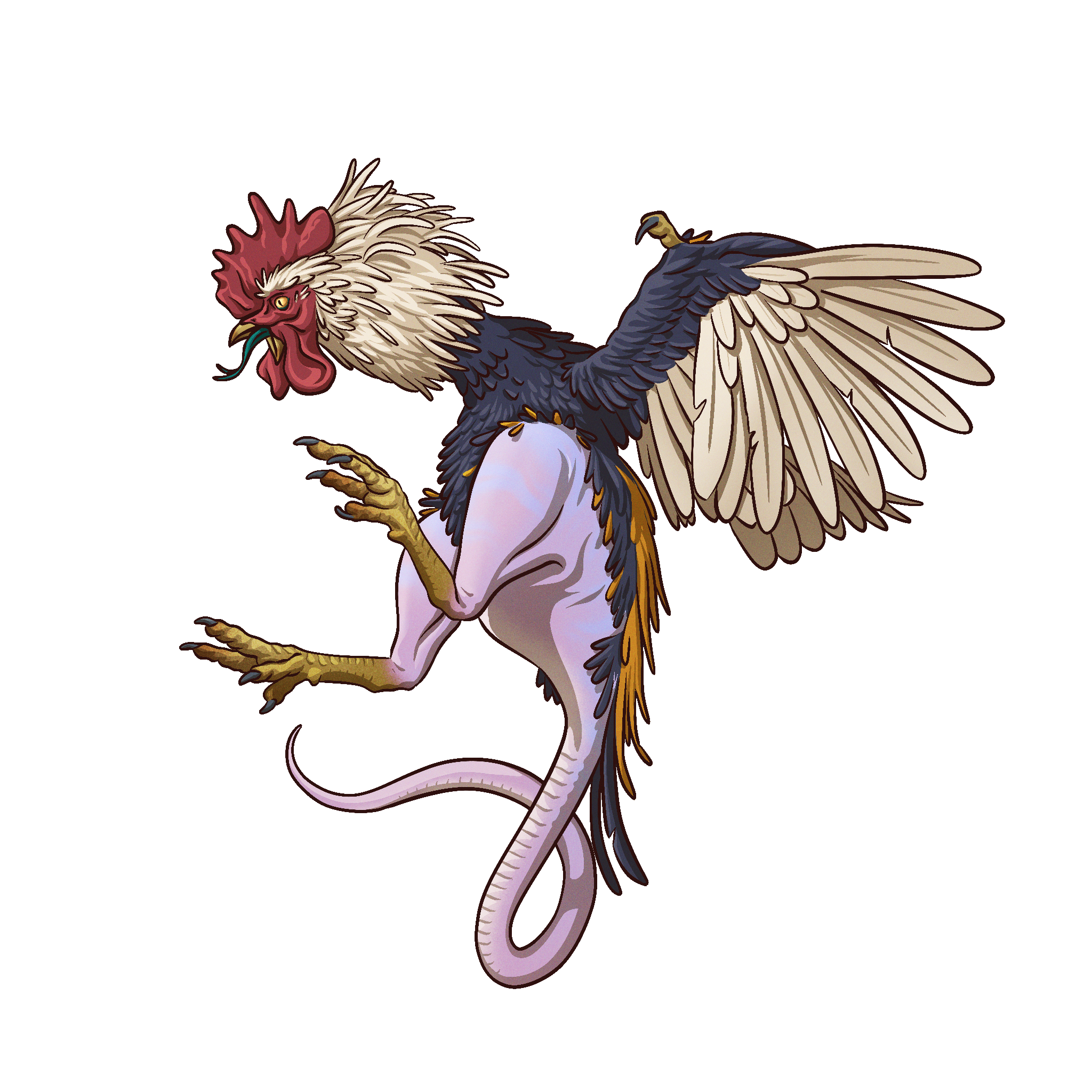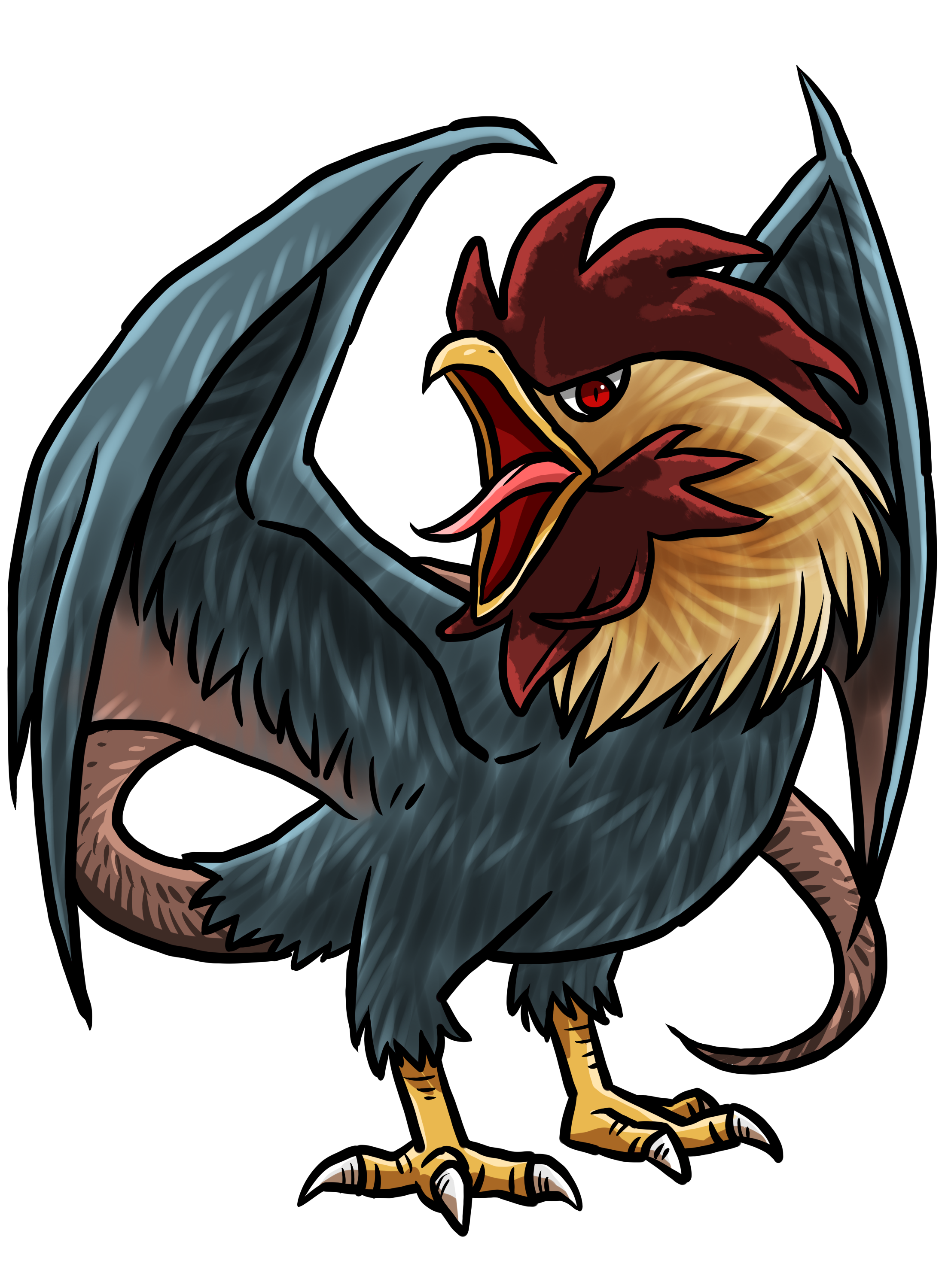 This hideous avian creature has the body of an emaciated rooster, the wings of a bat, and a long, scaly tail.