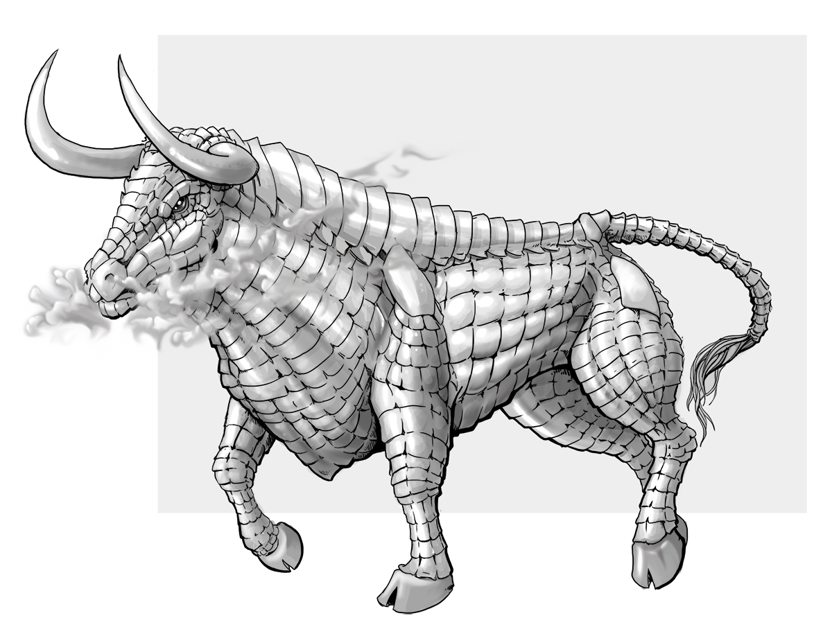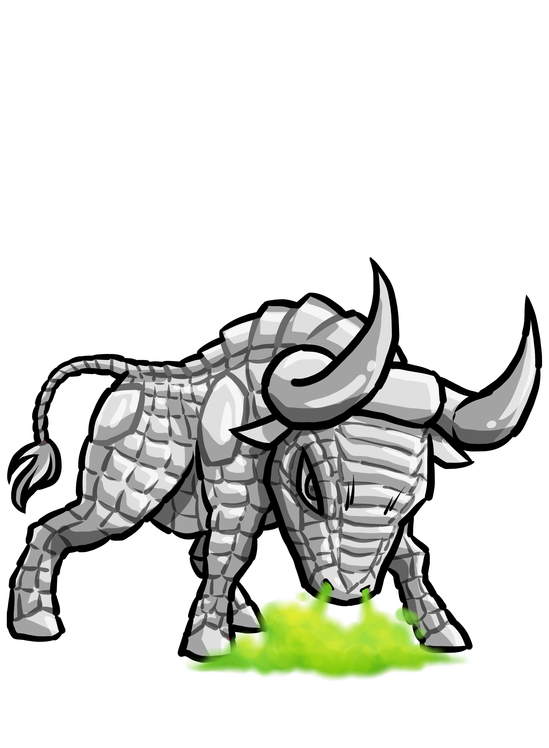 This bull-like creature seems to be made of interlocking metallic plates. Faint plumes of green smoke puff from its mouth.