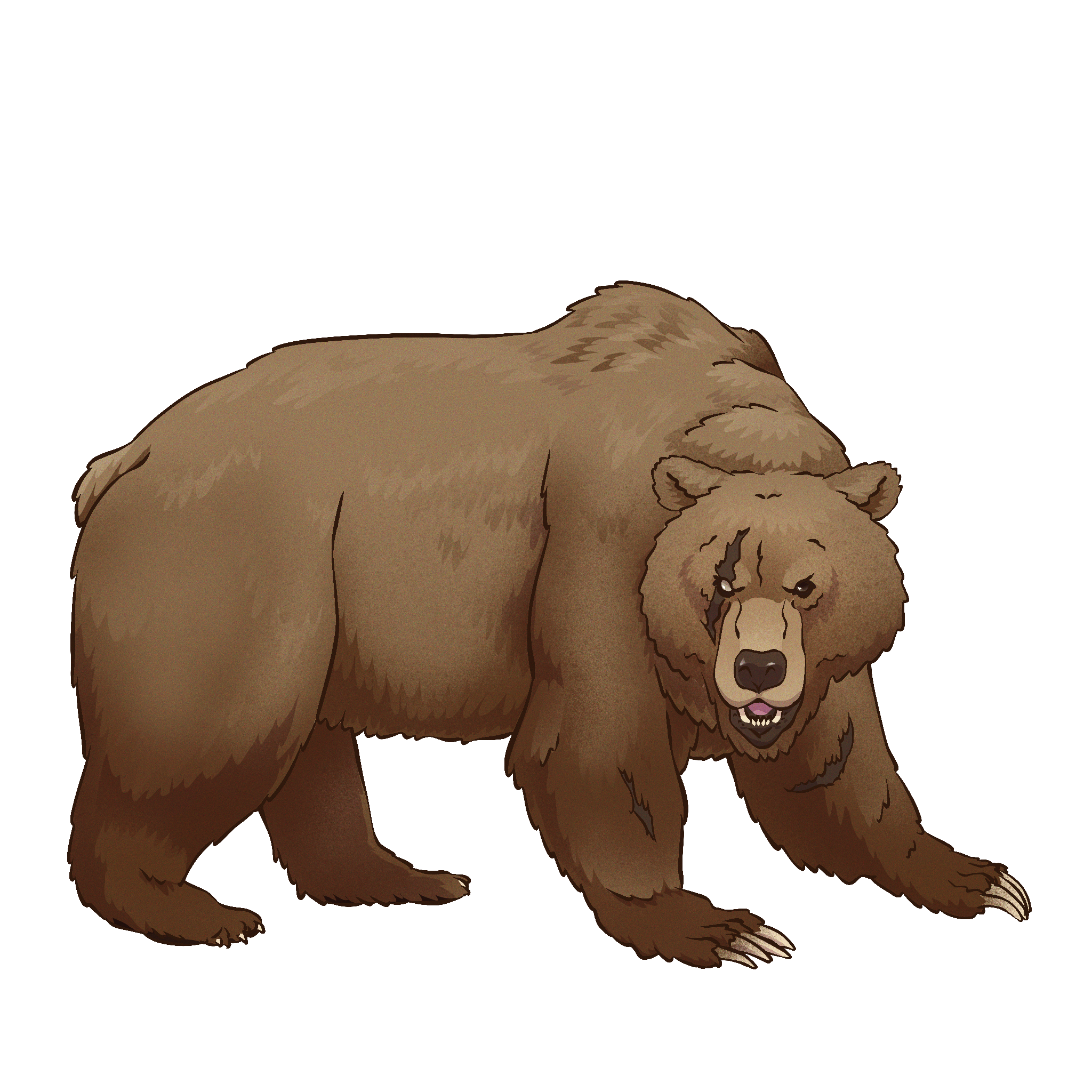Aggressive, 9' tall. Silver-tipped fur, brown or reddish brown in colour. Live in forests and mountains. Favour eating meat.