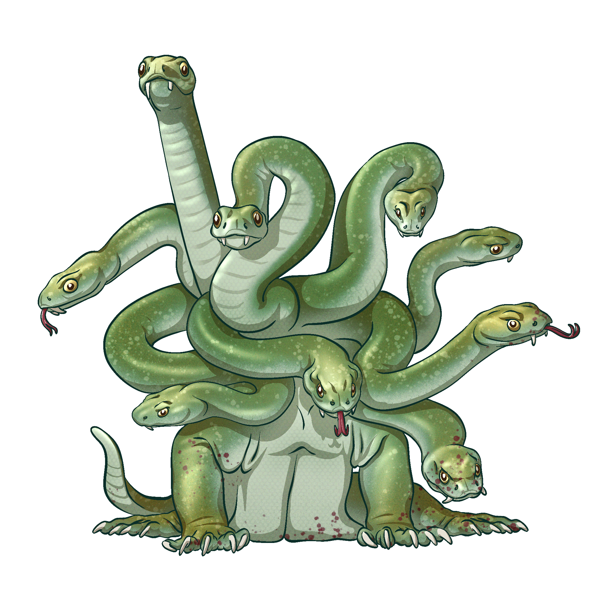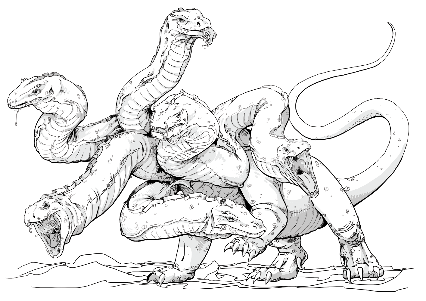 Hydras are reptile-like monsters with nine heads. A hydra is gray brown to dark brown, with a light yellow or tan underbelly. The eyes are amber, and the teeth are yellow-white. It is about 20 feet long and weighs about 4,000 pounds.