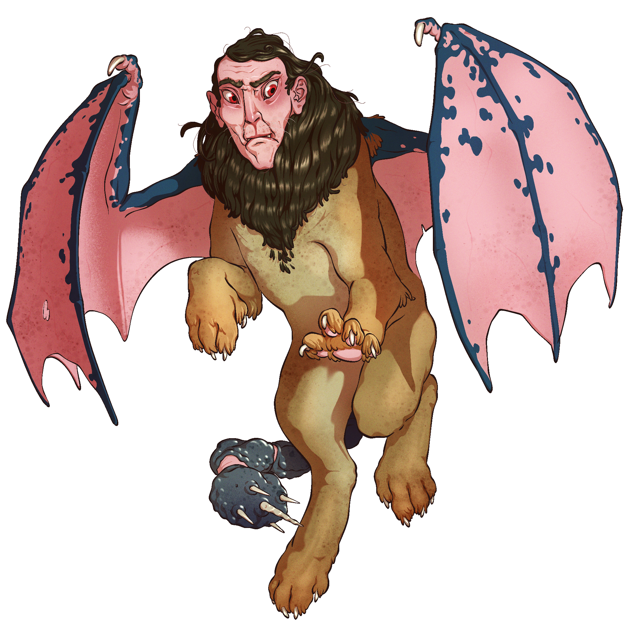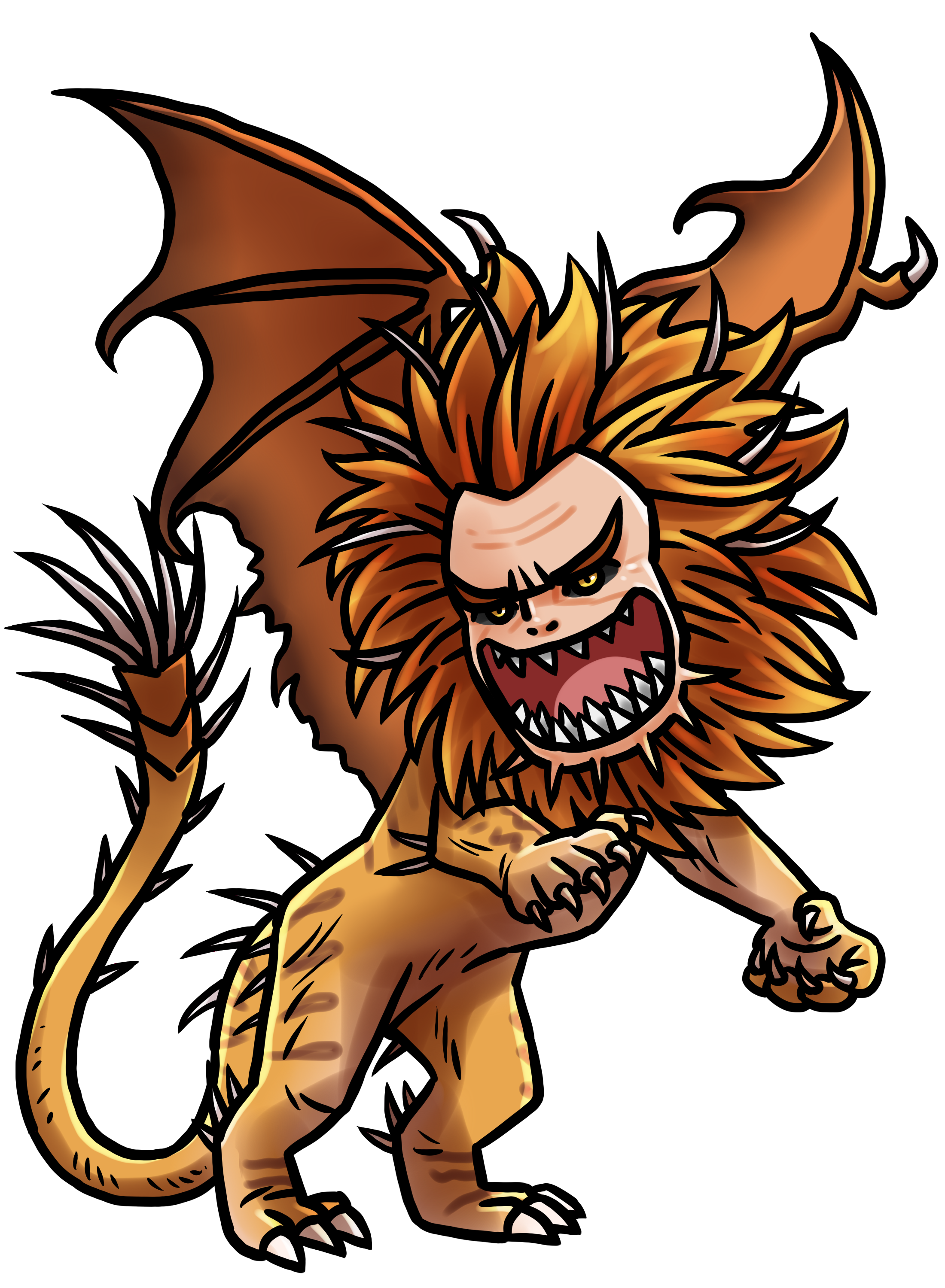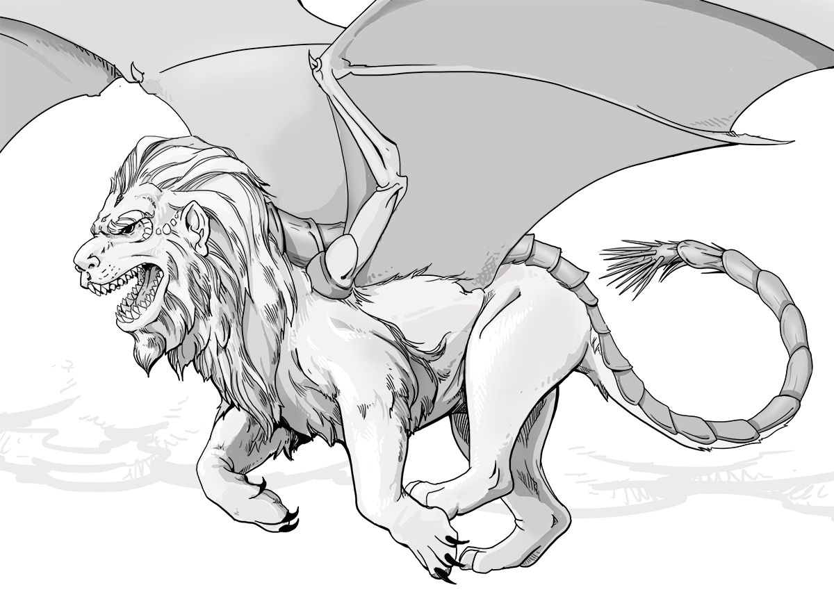 Monstrosities with the face of a man, the body of a lion, bat-like wings, and a tail bristling with spikes. Love eating humans. Dwell in wild, mountainous regions.