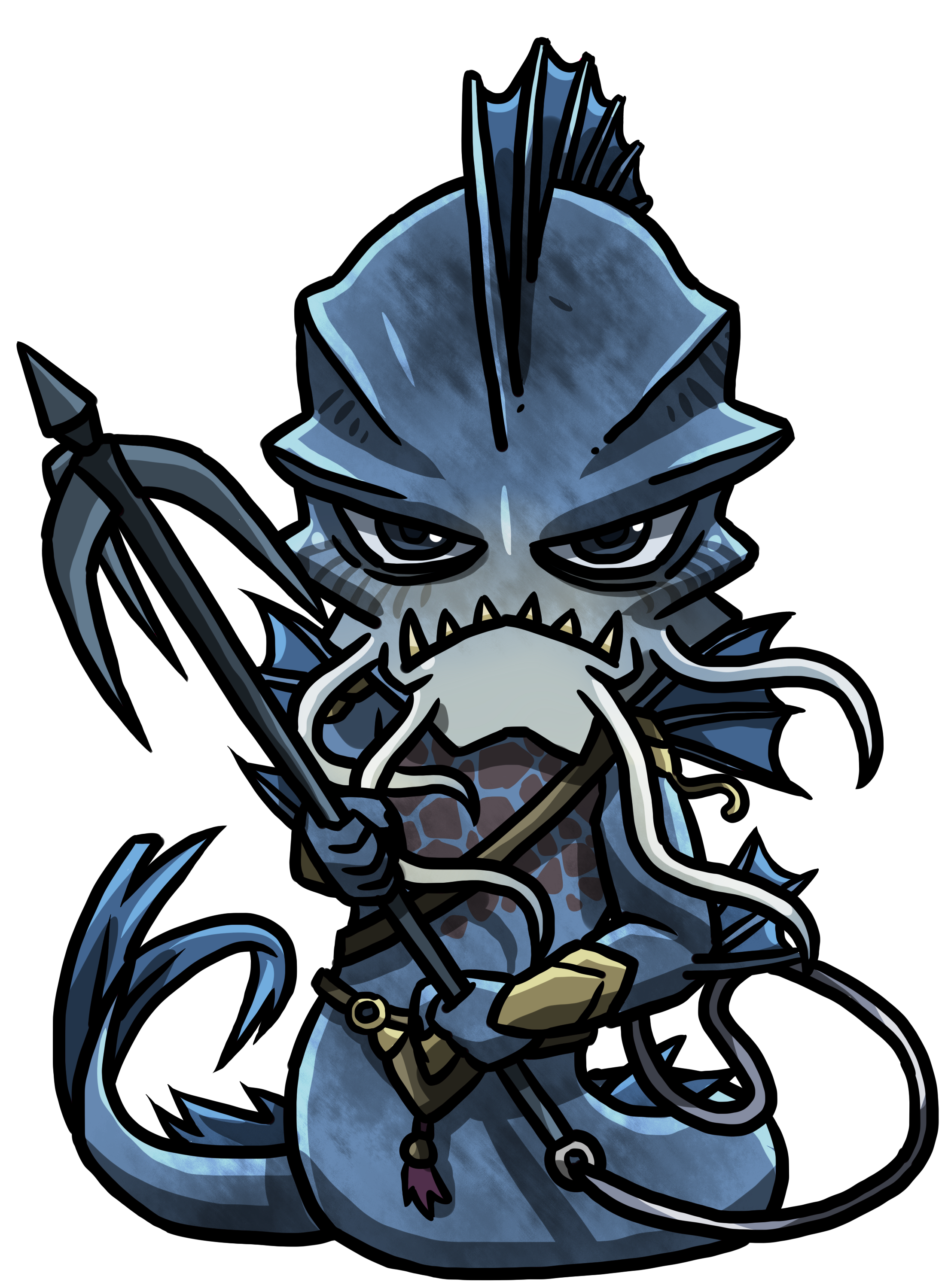 This giant has pale green, scaled skin and large, webbed hands and feet. On either side of its neck are slotted gills.