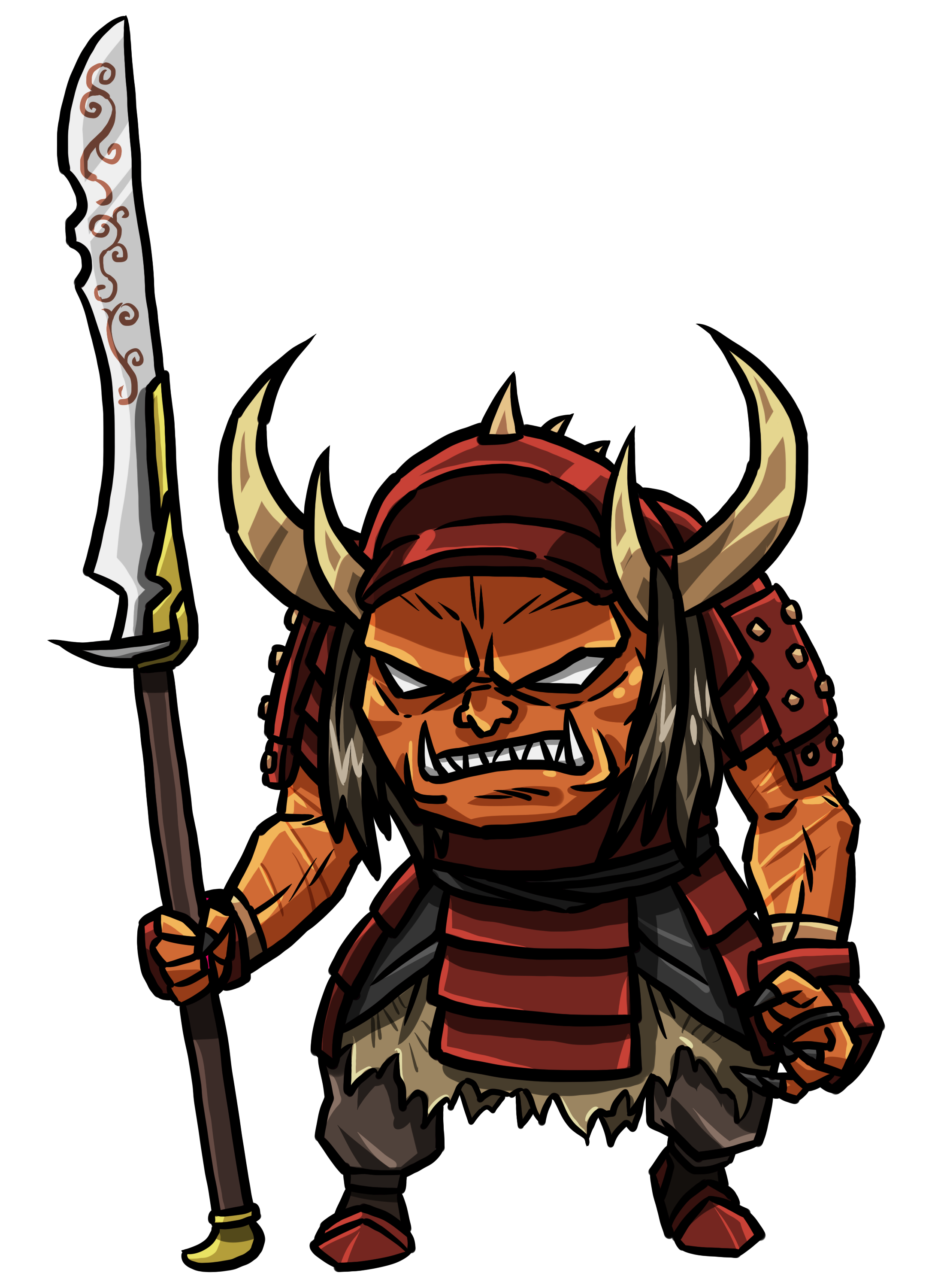 In nursery rhymes, oni are fearsome bogeymen that haunt the nightmares of children and adults alike, yet they are very real and always hungry. They find human babies especially delicious. Oni look like demonic ogres with blue or green skin, dark hair, and a pair of short ivory horns protruding from their foreheads. Their eyes are dark with strikingly white pupils, and their teeth and claws are jet black.
