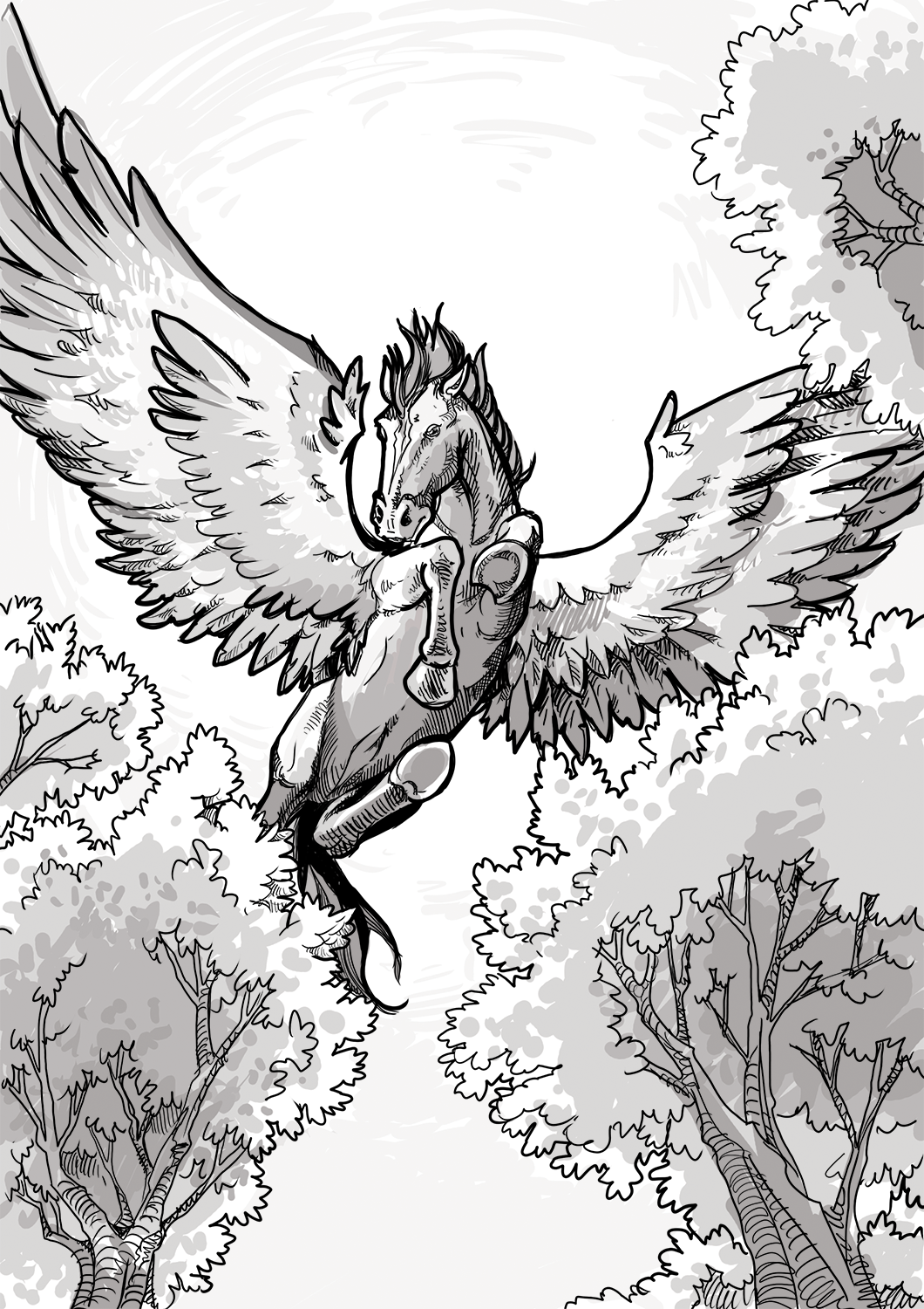 This magnificient horse has great bird-like wings upon its back and moves with a quiet and proud grace.