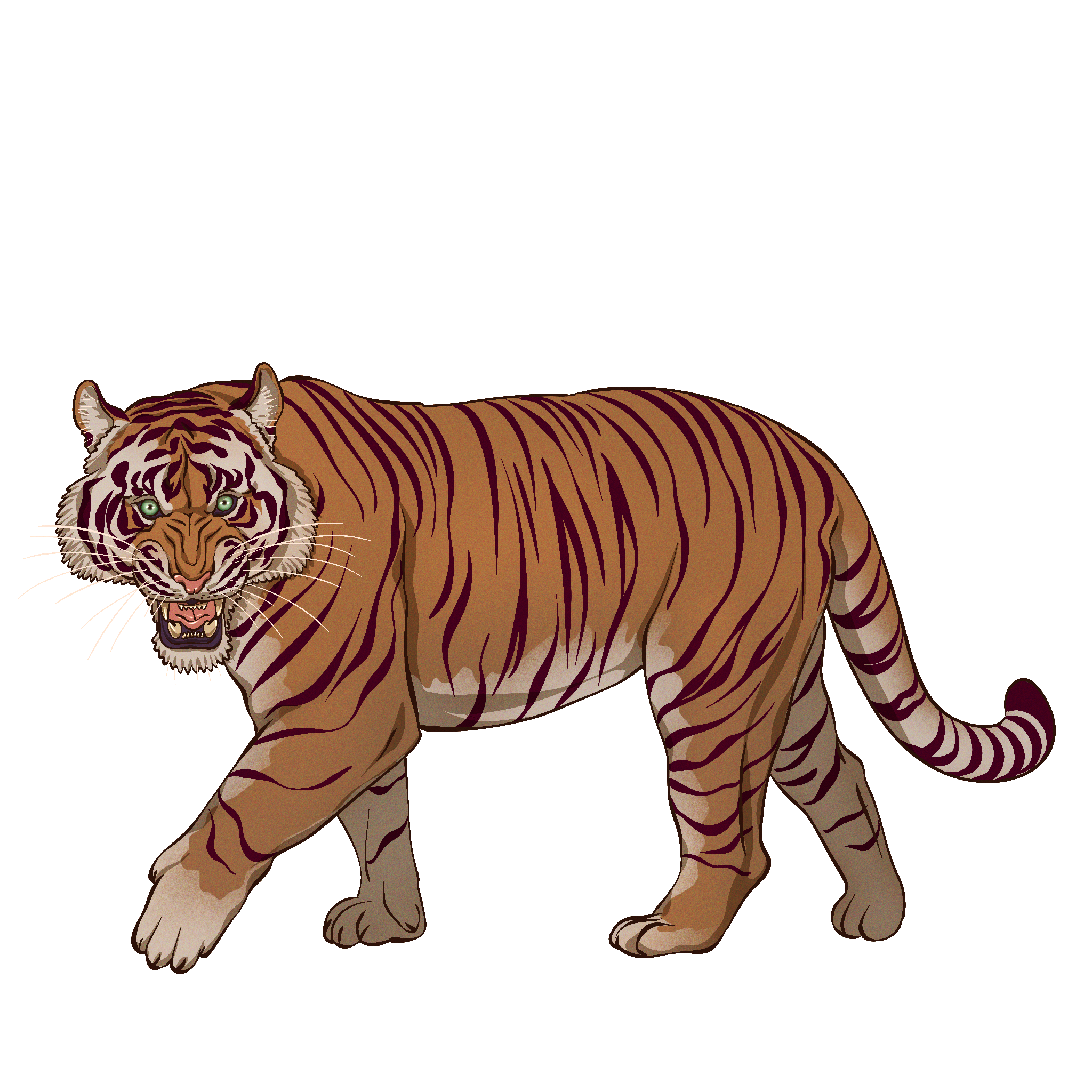 This powerful feline predator moves with a deadly grace, its reddish-orange fur slashed with black stripes.